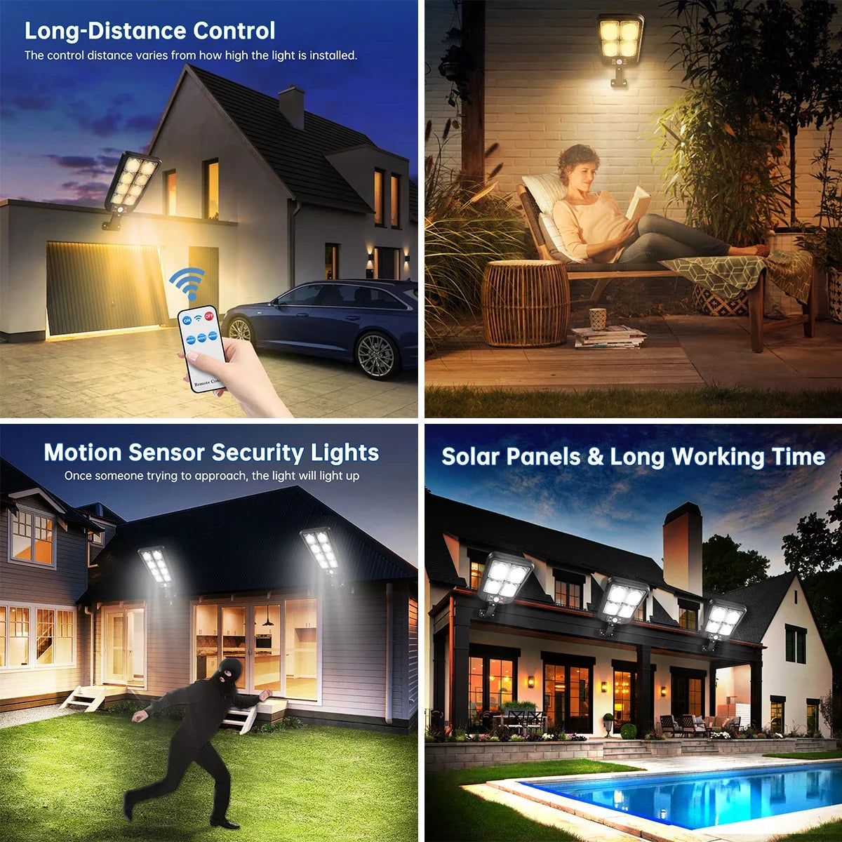【Extremely Bright Motion Sensor Outdoor Lights】--Solar lights outdoor uses high efficiency 100/200pcs high bright LED beads; The super output power exceeds other solar lights, The solar lights are equipped with 1200/2400mah battery , the working life is more than 50000+ hours, it only takes 6-8 hours to fully charge during the day;
