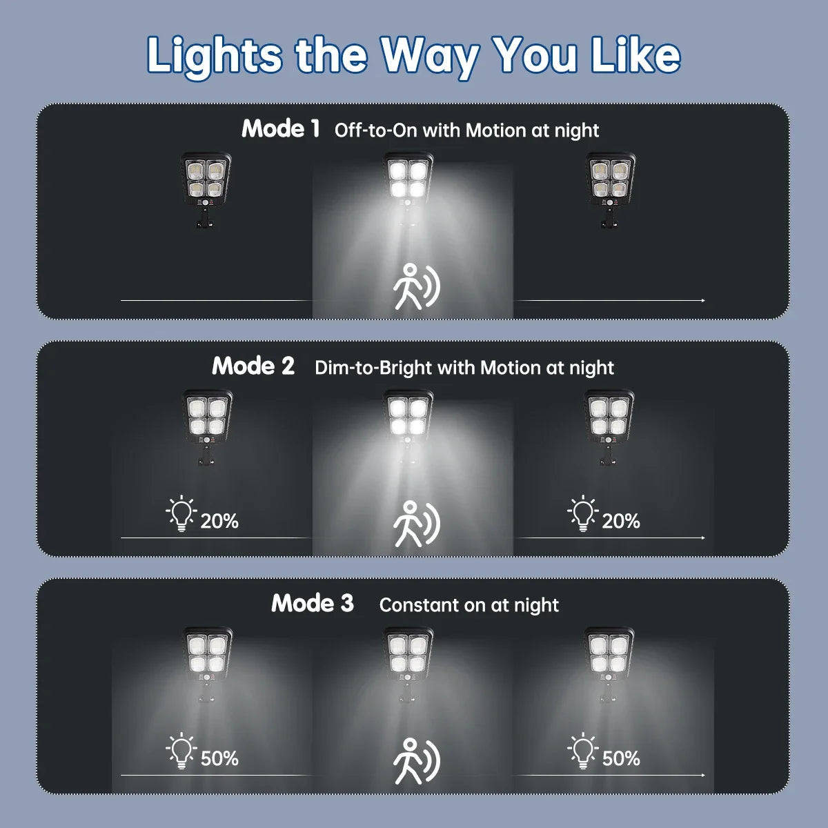 【Remote Control & 3 Lighting Modes】--Mode 1: The solar light stays off until motion is detected, the solar light turns on and turns off again after 20 seconds; Mode 2: The solar light keeps 20% brightness until motion is detected, the solar light turns to 100% brightness, 20% brightness will be restored after 20 seconds; Mode 3: The solar light is always on, maintaining 50% brightness;